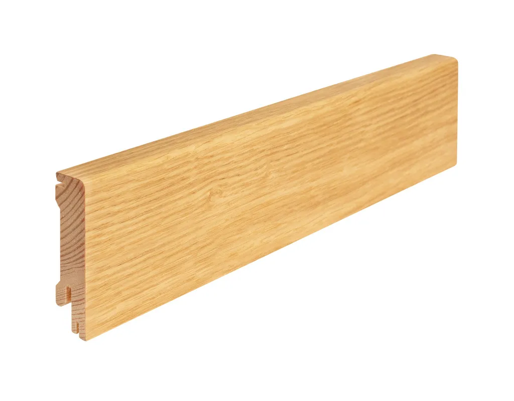 Die Sockelleiste von Hoco Timber überzeugt durch ihr hochwertiges Eiche Furnier auf massivem Kiefernholz. In einer ruhigen Sortierung sorgt sie für einen perfekten, harmonischen Übergang zu ihrem Parkett. Auf der Rückseite befindet sich eine Clipfräsung für den Hoco Clip.