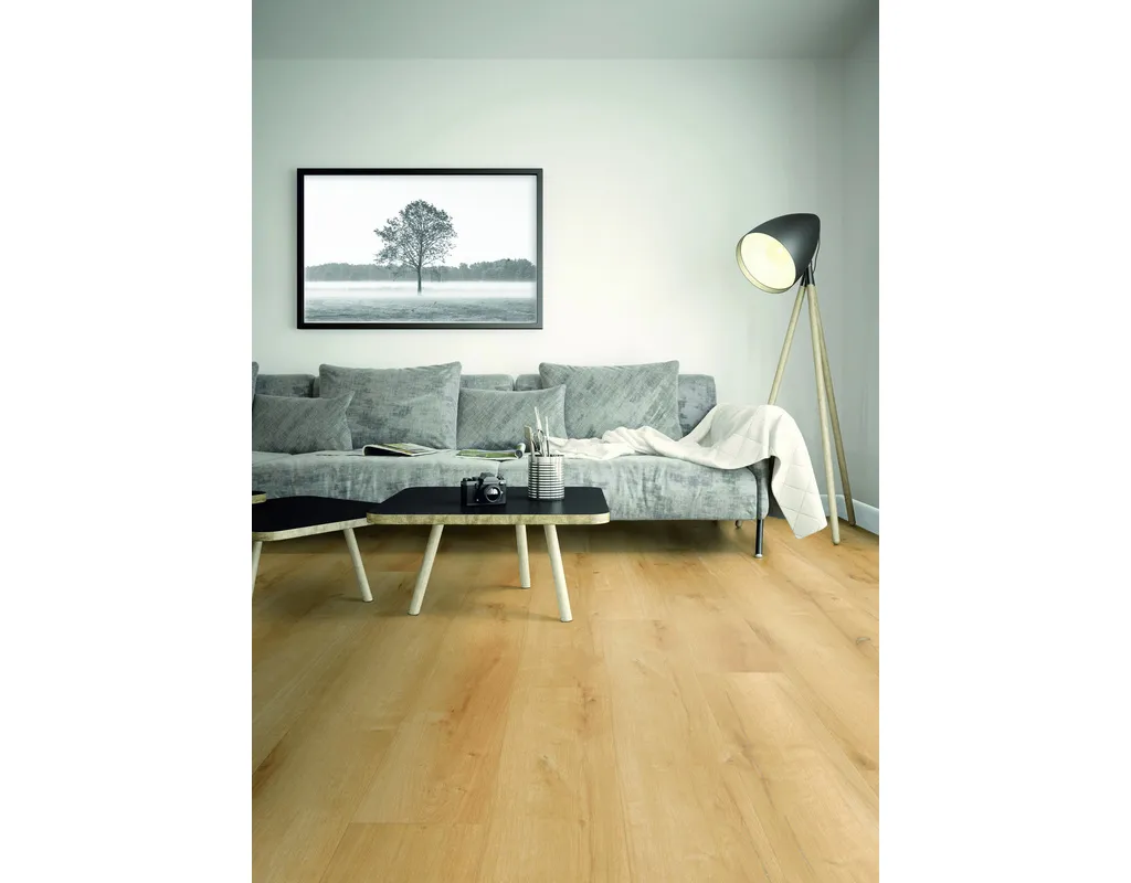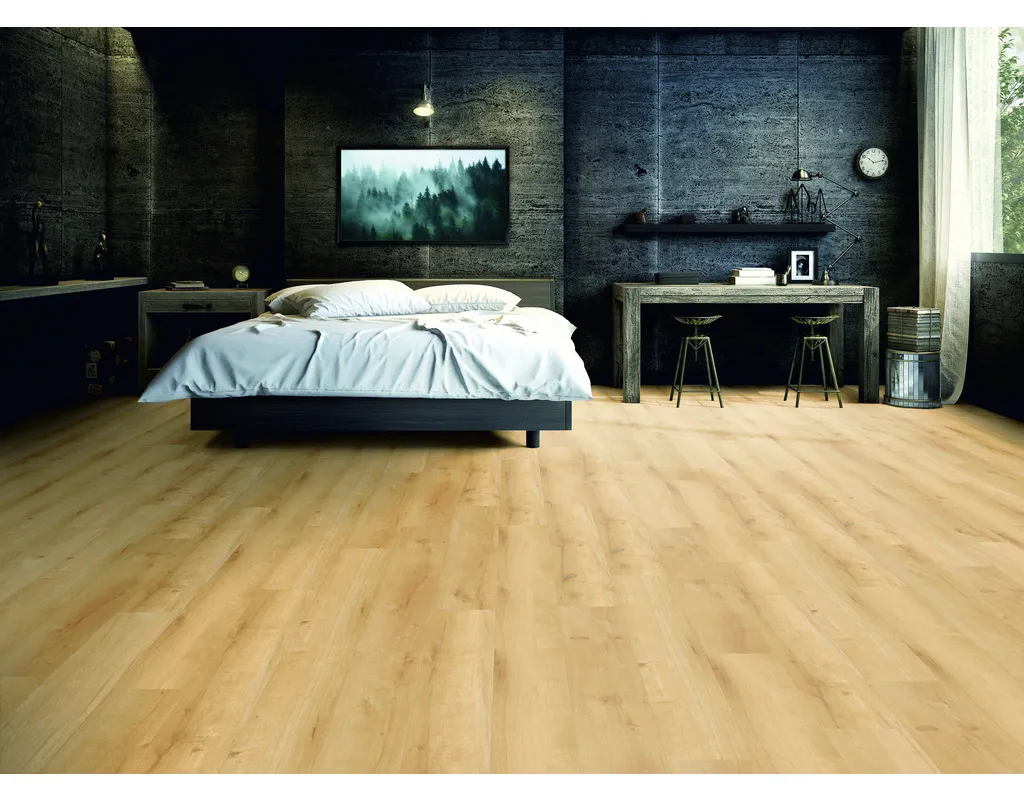 Eine 0,3 mm starke Nutzschicht mit Struktur sorgt für Strapazierfähigkeit und Pflegeleichtigkeit, die Dekorschicht bringt authentisches Design, und die doppelte Vinylträgerschicht garantiert Stabilität.