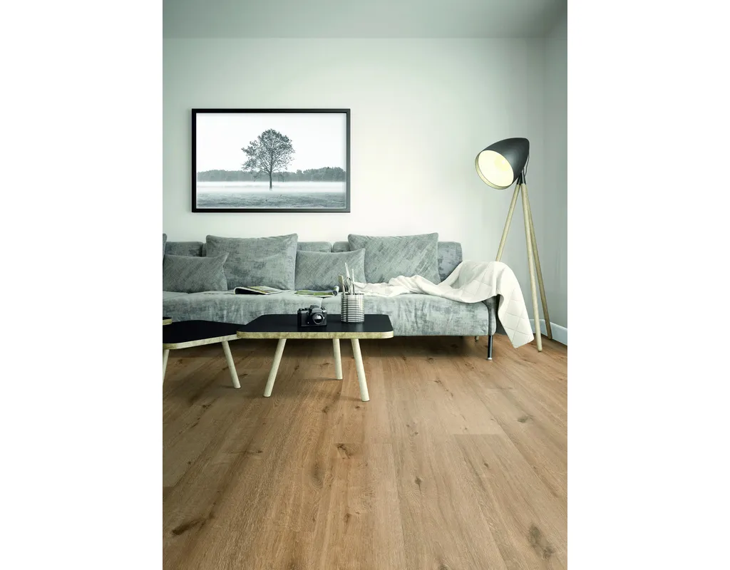 Eine 0,3 mm starke Nutzschicht mit Struktur sorgt für Strapazierfähigkeit und Pflegeleichtigkeit, die Dekorschicht bringt authentisches Design, und die doppelte Vinylträgerschicht garantiert Stabilität.