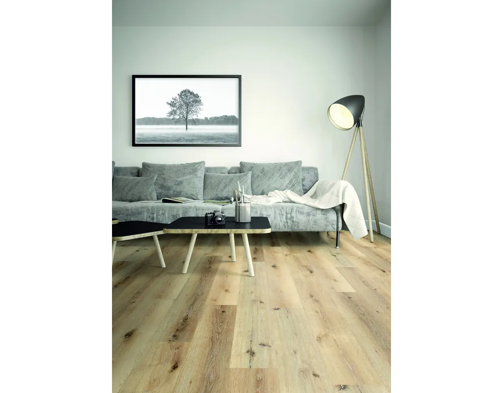 Eine 0,3 mm transparente Nutzschicht mit Struktur sorgt für Strapazierfähigkeit, die Dekorschicht verleiht ein authentisches Design, und die integrierte Trittschalldämmung macht den Boden angenehm leise.