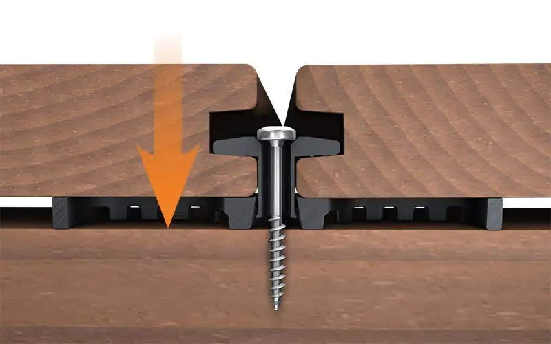 Der Terraflex Pro N6 ist eine unsichtbare Befestigung für Dielen mit Nut, dient als Abstandhalter für einen gleichmäßigen Fugenabstand von nur 5 mm und bietet konstruktiven Holzschutz. Die Metallplatte des Terraflex Pro erlaubt eine Montage schon ab einer Nutstärke von 2 mm.