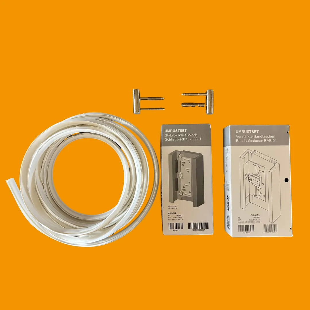 Aufrüst-Set für Standardzargen: Wohnungseingangsset in Weiß mit Dichtung, V4400 Bandmittelteil, 2x BAB 01 und verstärktem Schließblech - ideal zur Umrüstung auf eine stabile, dicht schließende Wohnungseingangstür.