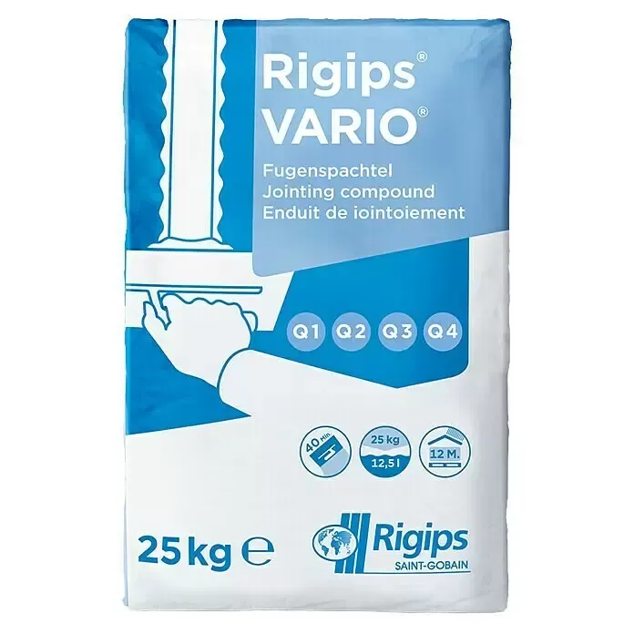 Der Vario Fugenspachtel ist ein gipsgebundenes und hoch kunststoffvergütetes Fugenspachtelmaterial. Die Verarbeitungszeit beträgt ca. 40 Minuten. Das Material lässt sich schnell und klumpenfrei anrühren. Es zeichnet sich durch sehr gutes Haftvermögen aus. Der Fugenspachtel hat ein äußerst geringes Einfallverhalten und verfügt über sehr hohe Fugenfestigkeiten (mit Glasfaserbewehrungsstreifen). Es lässt sich sehr geschmeidig verarbeiten und ist sehr leicht schleifbar. Verbrauch: ca. 300 g/qm. Die Verarbeitungszeit beträgt min. 40 min.